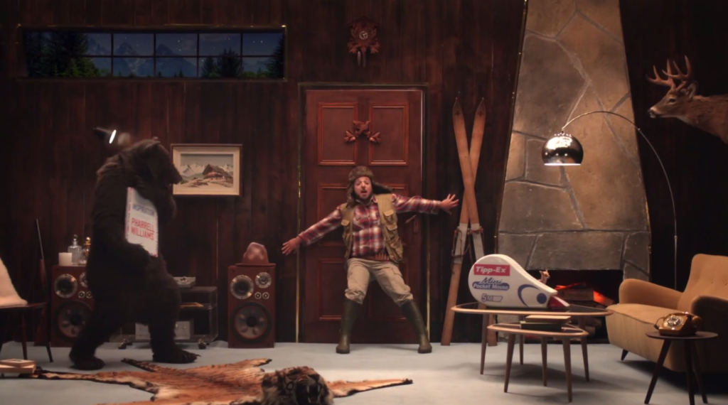 Tipp-Ex and Buzzman asked Pharrell Williams to write a book about his life and his sources of inspiration. A few hours before the book’s release, the Bear panics after seeing that an incredible amount of Pharrell William’s fans try to enter the shed to seize the book from him. He therefore decides to discretely put some Tipp-Ex on every page in order to save the content of the book.